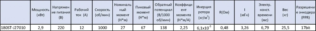 - STEP/DIR (синонимы STEP/SIGN, PULSE/DIR, PULSE/SIGN) - управление по 2 сигналам, логический 0/1 направление и меандр тактирования. Два оптоизолированных входа с сопротивлением 270 Ом для использования 5 В логики, при использовании напряжения выше 5В(12/24) в комплекте поставляется резистор на 2 кОм.Сервокомплект поставляется с сервомотором 180ST-J27010 в базовом оснащении с абсолютным энкодером TAMAGAWA 17 bit, все параметры привода приведены в таблице ниже.