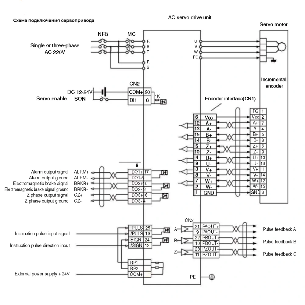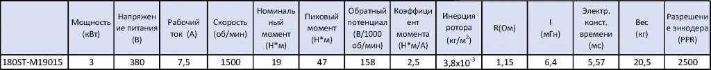 - STEP/DIR (синонимы STEP/SIGN, PULSE/DIR, PULSE/SIGN) - управление по 2 сигналам, логический 0/1 направление и меандр тактирования. Два оптоизолированных входа с сопротивлением 270 Ом для использования 5 В логики, при использовании напряжения выше 5В(12/24) в комплекте поставляется резистор на 2 кОм.Сервокомплект поставляется с PMSM приводом 180ST-M19015 в базовом оснащении с инкрементным энкодером TAMAGAWA на 2500 строк, все характеристики серводвигателя приведены в таблице ниже.