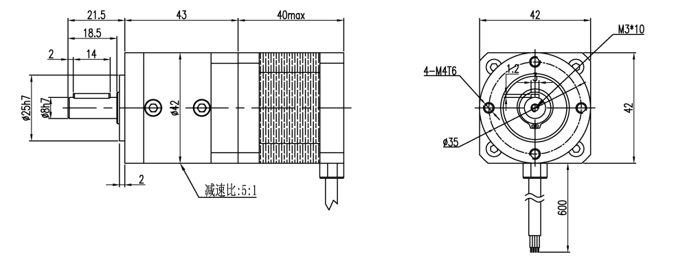 Мотор-редуктор с фланцем 42 мм (NEMA17), длиной корпуса 40 мм + редуктор 43 мм, имеет защищенный кабельный ввод, момент удержания 1,9 Н*м, корпус - пластинчатая кремниевая сталь, фланцы - дюраль, высококачественные подшипники DAHL/C&U обеспечивают минимальную вероятность проявления резонанса с их собственной частотой.