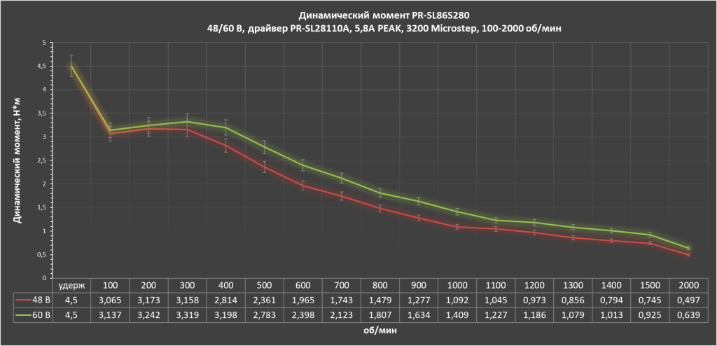 График изменения динамического момента шагового двигателя PR-SL86S280-BRK, от 0 до 2000 об/мин, 24 В/48 В/60 В